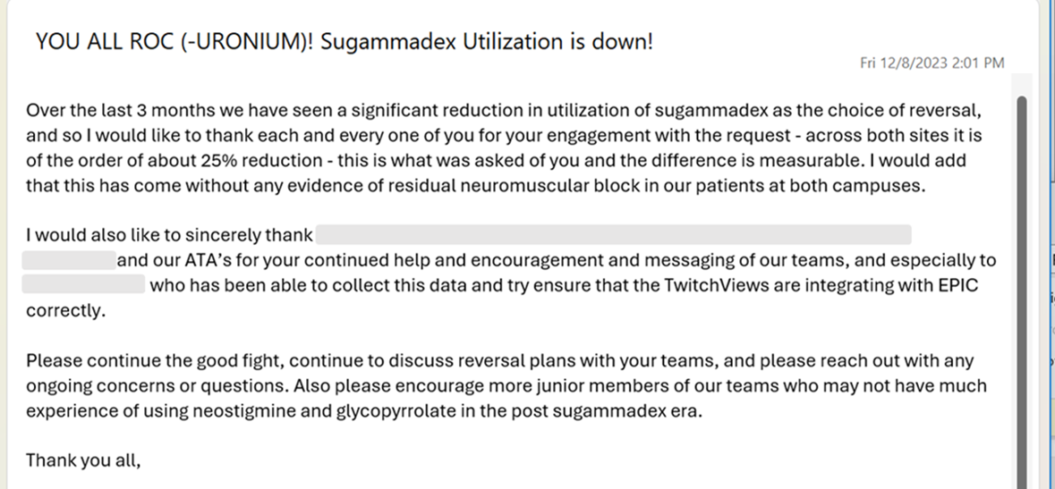 Pictured below the Executive Vice Chair of a leading academic institution shares an encouraging update with staff. After combined educational efforts by Blink Device Company and promotional efforts by clinical leadership, anesthesia providers reduced overall utilization of sugammadex by 25%, which translates to a $75,000.00 savings per quarter or $300,000 per year. Of note, a TwitchView train of four monitor is installed in every anesthetizing location across the health system. The achieved results required several months of dedicated effort and show one potential positive outcome when quantitative monitors are routinely used.